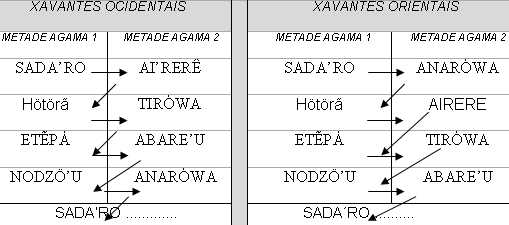 En las dos tablas abajo está representado el ciclo de las clases de edad entre los “Xavante Occidentales” y “Orientales”. Debe repararse que el nombre de cada clase de edad es el mismo en ambas regiones, sólo cambiando el orden de la sucesión de aquellas que componen a las respectivas mitades ágamas identificadas por el número 2.